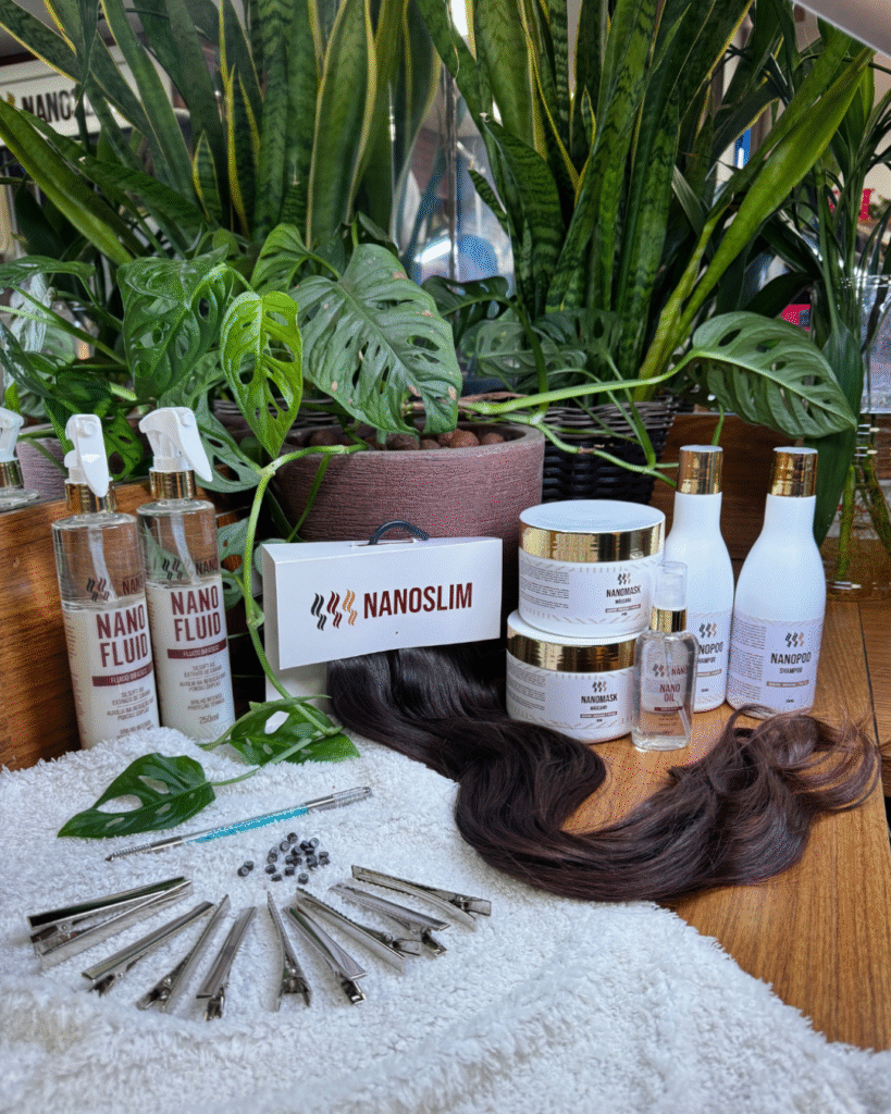 The kit includes the mega hair extensions, hair application tools, hair care products for use after applying the mega hair extensions, and a course on how to apply your NANOslim.